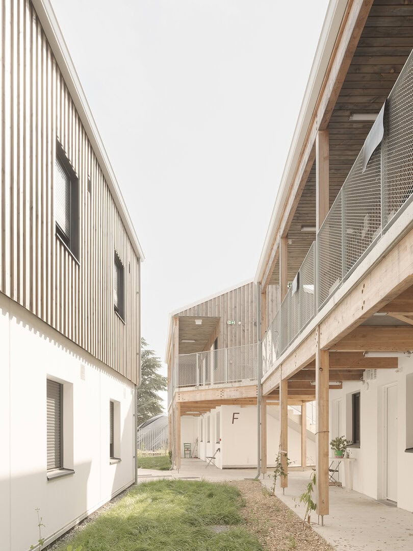 Les constructions sont pensées selon un mode constructif modulaires en bois et béton pour les logements, avec une isolation biosourcée et une desserte via des coursives extérieures bois; ceci afin de répondre au caractère d’urgence de la construction. Les espaces communs sont conçus en construction traditionnelle maçonnerie avec une ITE.